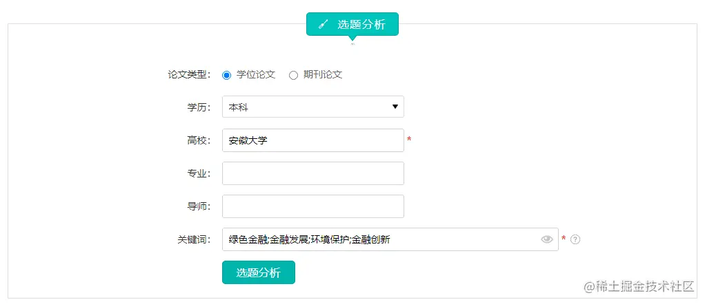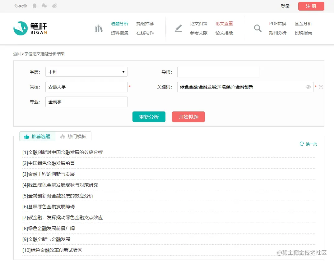 进入笔杆网,选择选题分析,输入高校、关键词等信息(打*的是必填项);