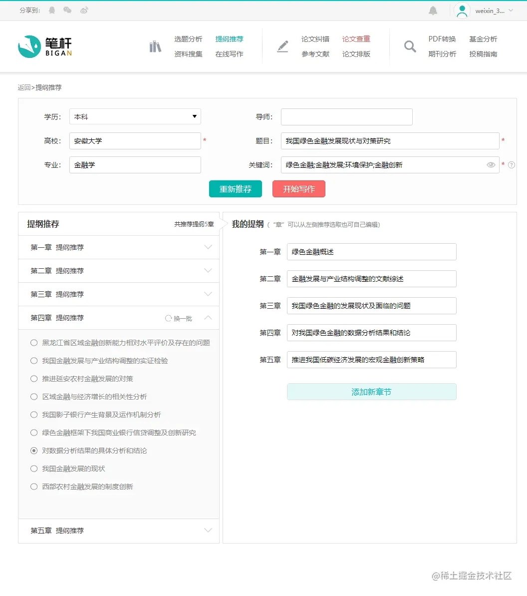 点击左侧提纲推荐一栏,可以选择各章的提纲内容,也可以自己编辑,最后点击开始写作,就可以啦!