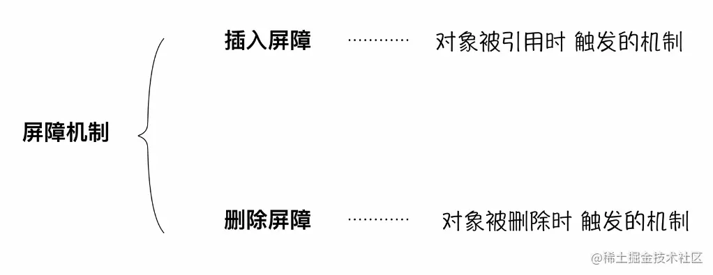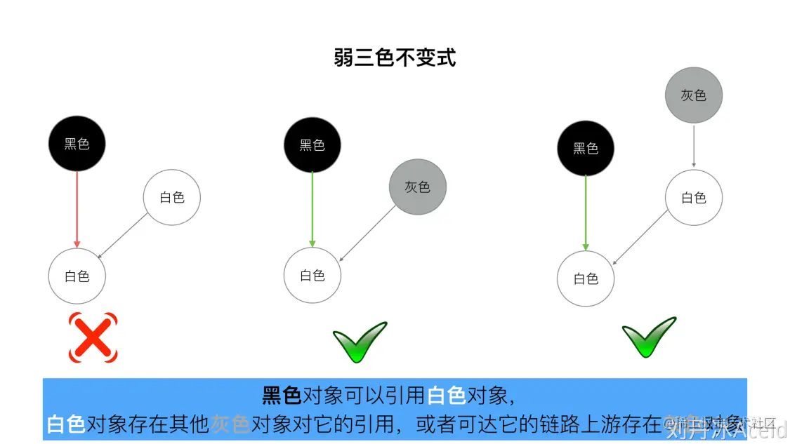 强三色不变式: 强制性不允许黑色对象引用到白色对象的指针。