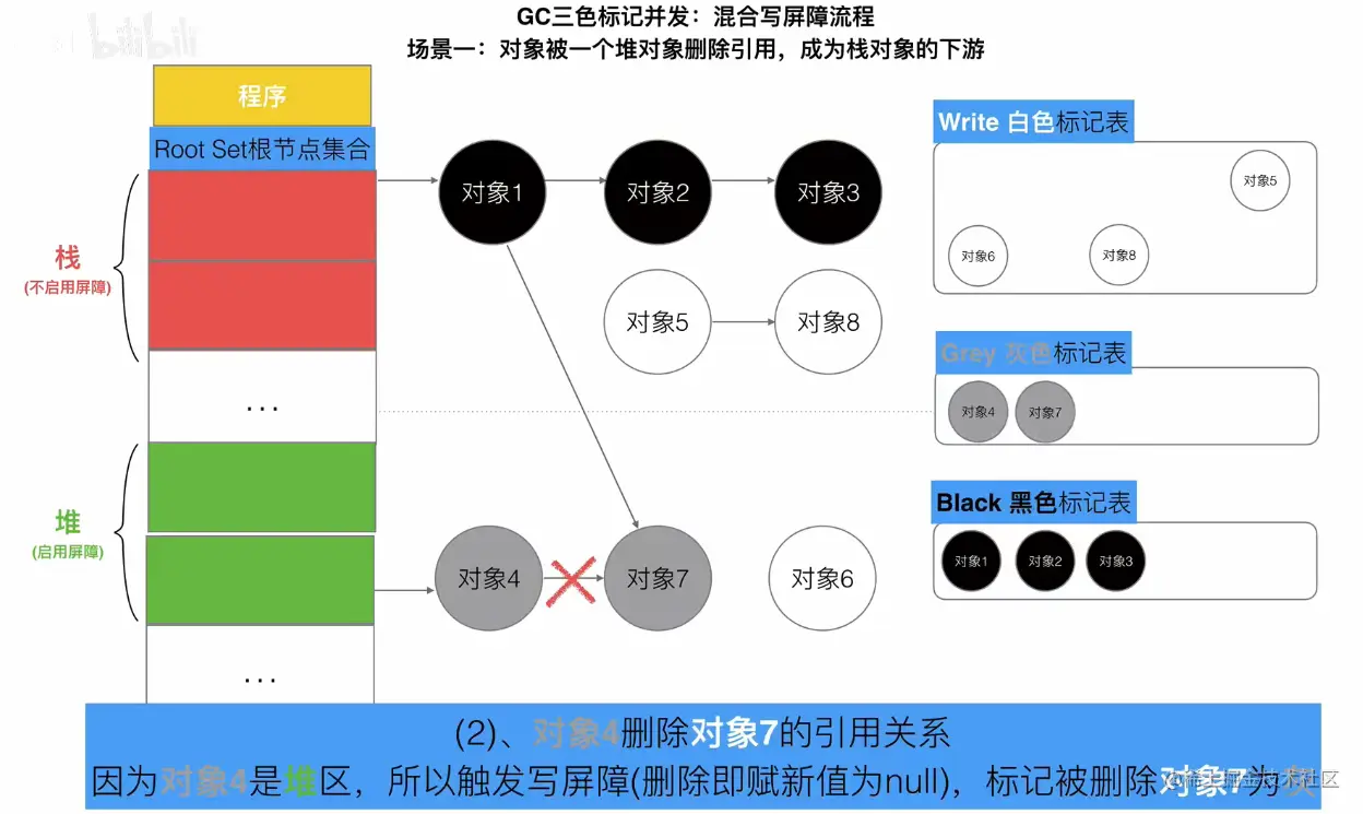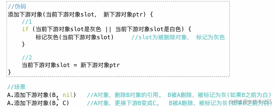 具体操作: 被删除的对象,如果自身为灰色或者白色,那么被标记为灰色。