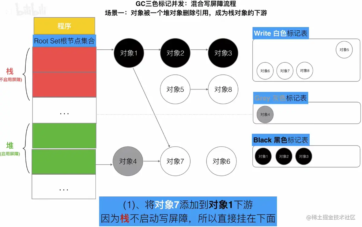 - 在堆上被删除的对象标记为灰色(保护删除对象的下游)。