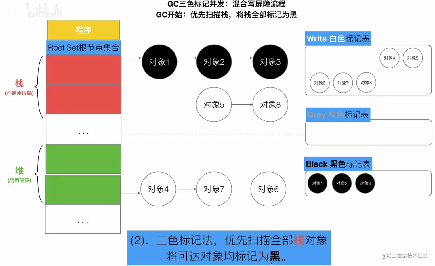 - GC开始将栈上的对象全部扫描并标记为黑色(之后不再进行第二次重复扫描,无需STW),