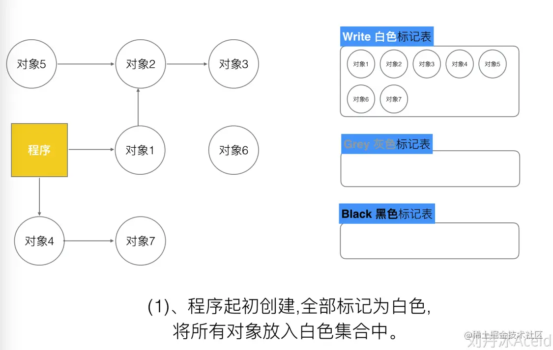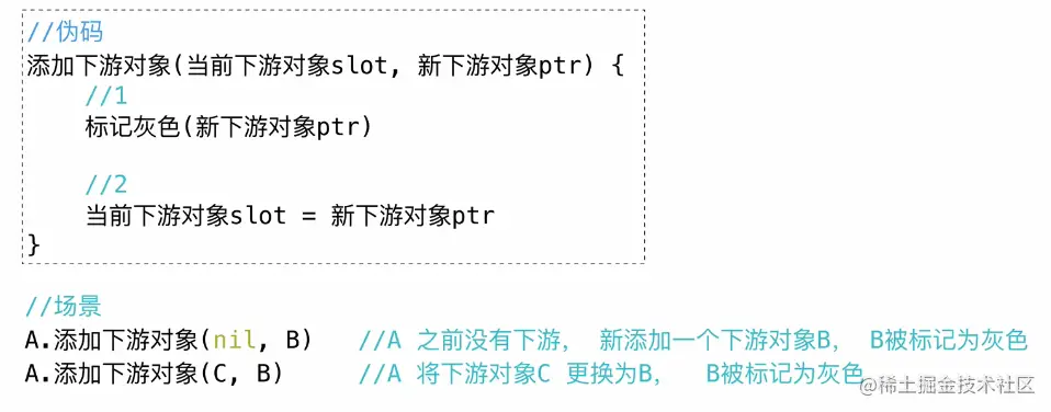 具体操作: 在A对象引用B对象的时候,B对象被标记为灰色。(将B挂在A下游,B必须被标记为灰色)
