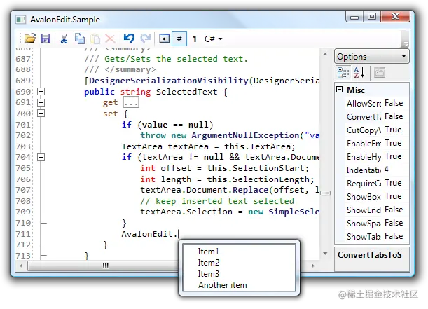 AvalonEdit是基于WPF的代码显示控件,可以支持代码高亮显示、智能提示、代码折叠等功能。