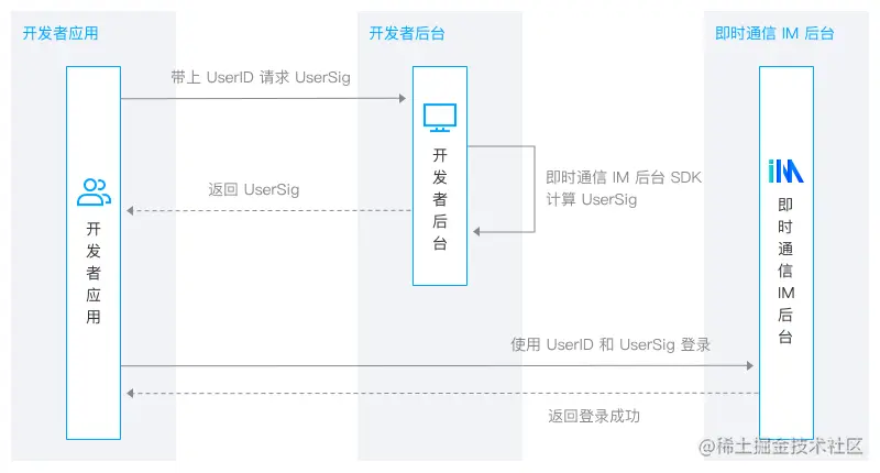 例如,App 里有一个用户,该用户的 ID 是27149 ,那么您可以用27149作为登录即时通信 IM 的 UserID。 - UserSig:用户登录即时通信 IM 时使用的密码,其本质是 App Server 用密钥对 UserID 等信息加密后的数据(token)