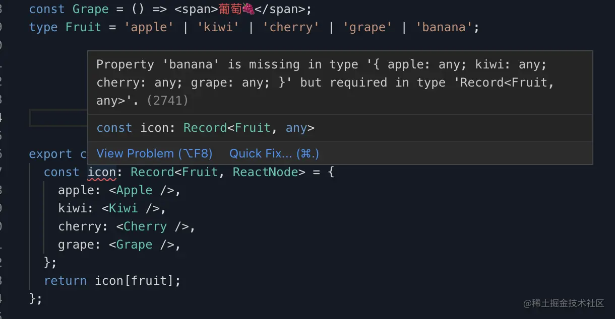 给 Fruit 类型添加一个 banana 字面量类型,利用 TypeScript 的类型检查,变量 icon 直接类型提示缺少 banana 属性(解决了提出的问题 1),当我们添加上 banana 这个 key 顺便健全了条件(解决了提出的问题 2)。