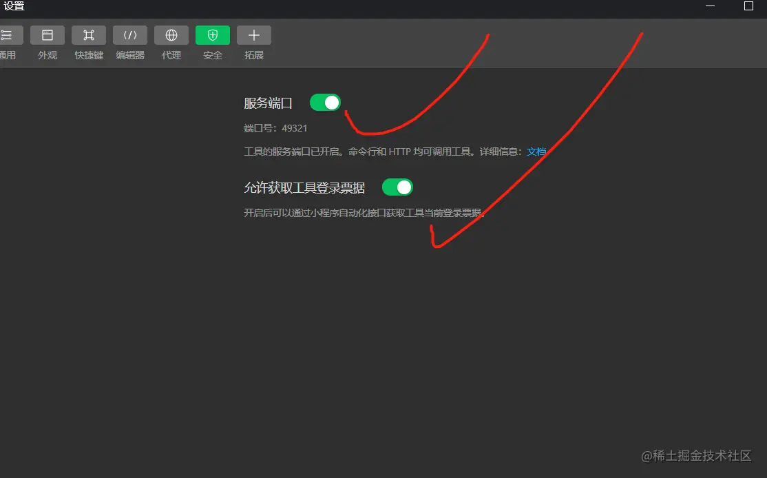 打开微信开发者工具,然后点击设置然后再点击安全设置。