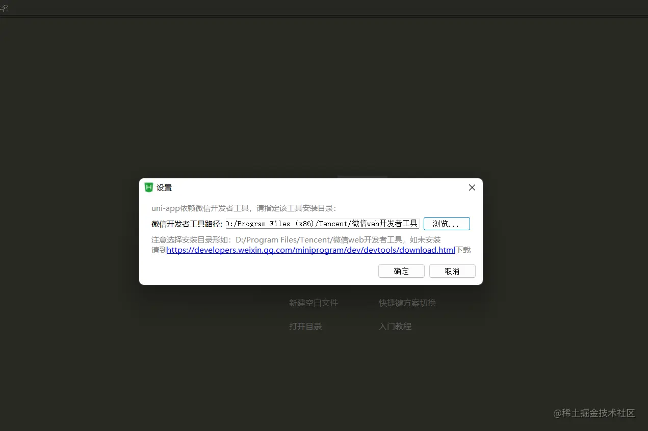 第十步,把你电脑微信开发者工具安装好的路径告诉DCloud公司开发的软件,点击确定。