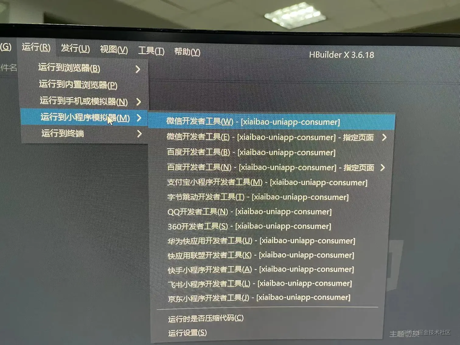 第九步,我们选择运行,然后运行到小程序模拟器,然后选择微信开发者工具。
