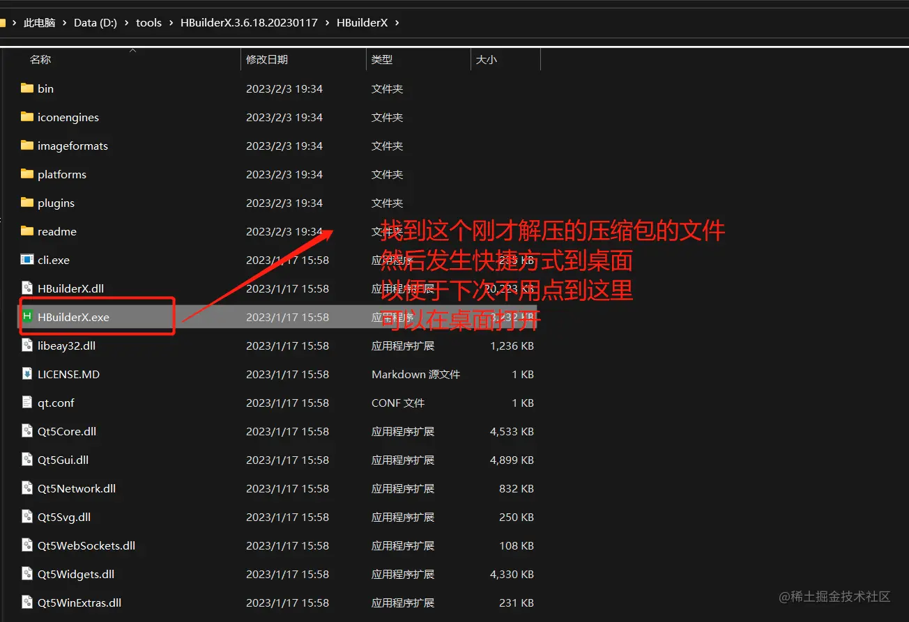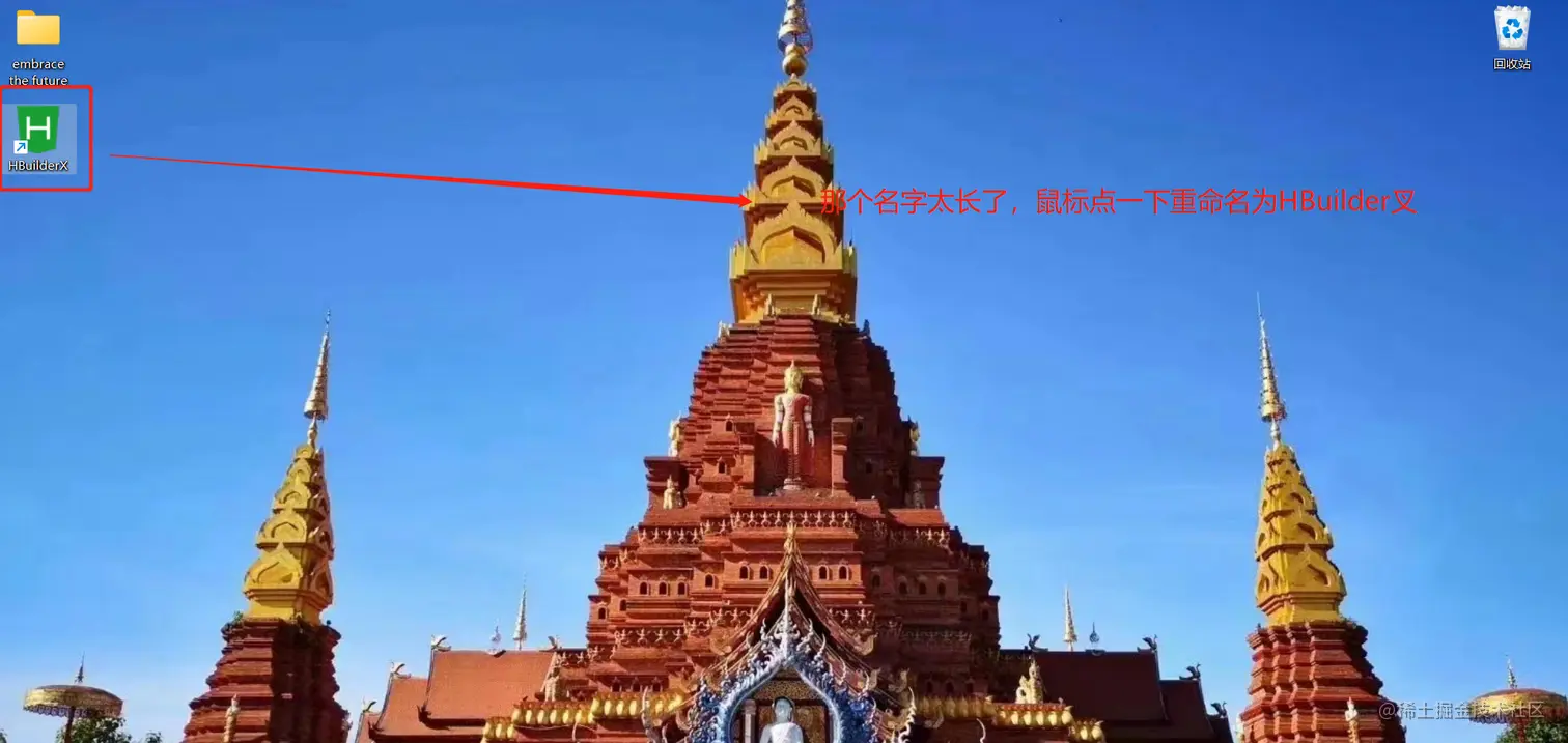第五步,我们看一下效果吧,你会发现这个exe文件的快捷方式名字太拖沓,鼠标点一下,给它命名为HBuilderX,我们双击看下DCloud做的产品长啥样吧。