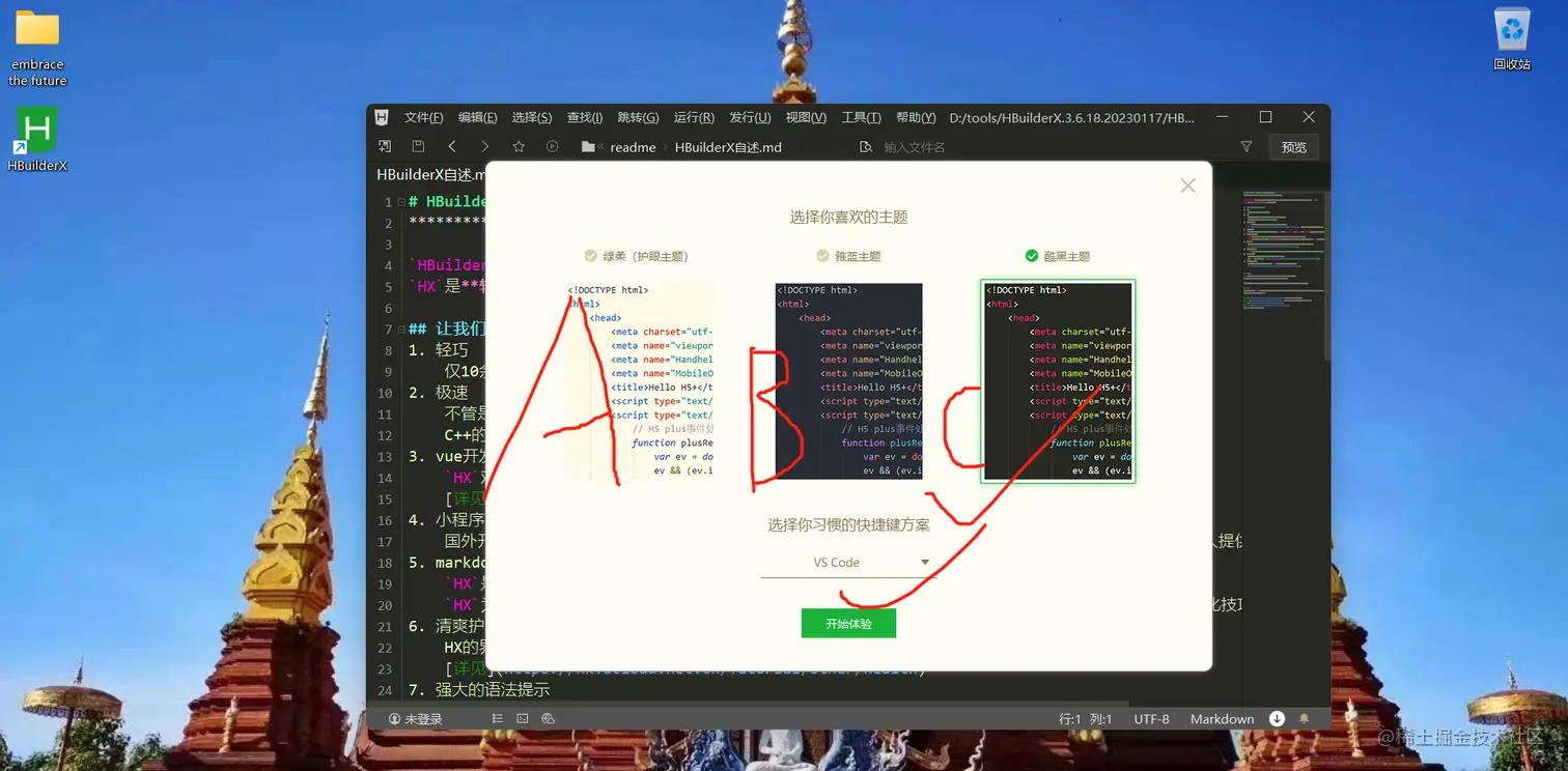 第六步,看到了吗,双击后长这样,又到了做选择题的时候,有ABC三个三个选项,我选C,这个又骚又酷黑的颜色艳丽的,然后呢,快捷键我们选择这个宇宙最好用的轻量级编辑器VS Code。