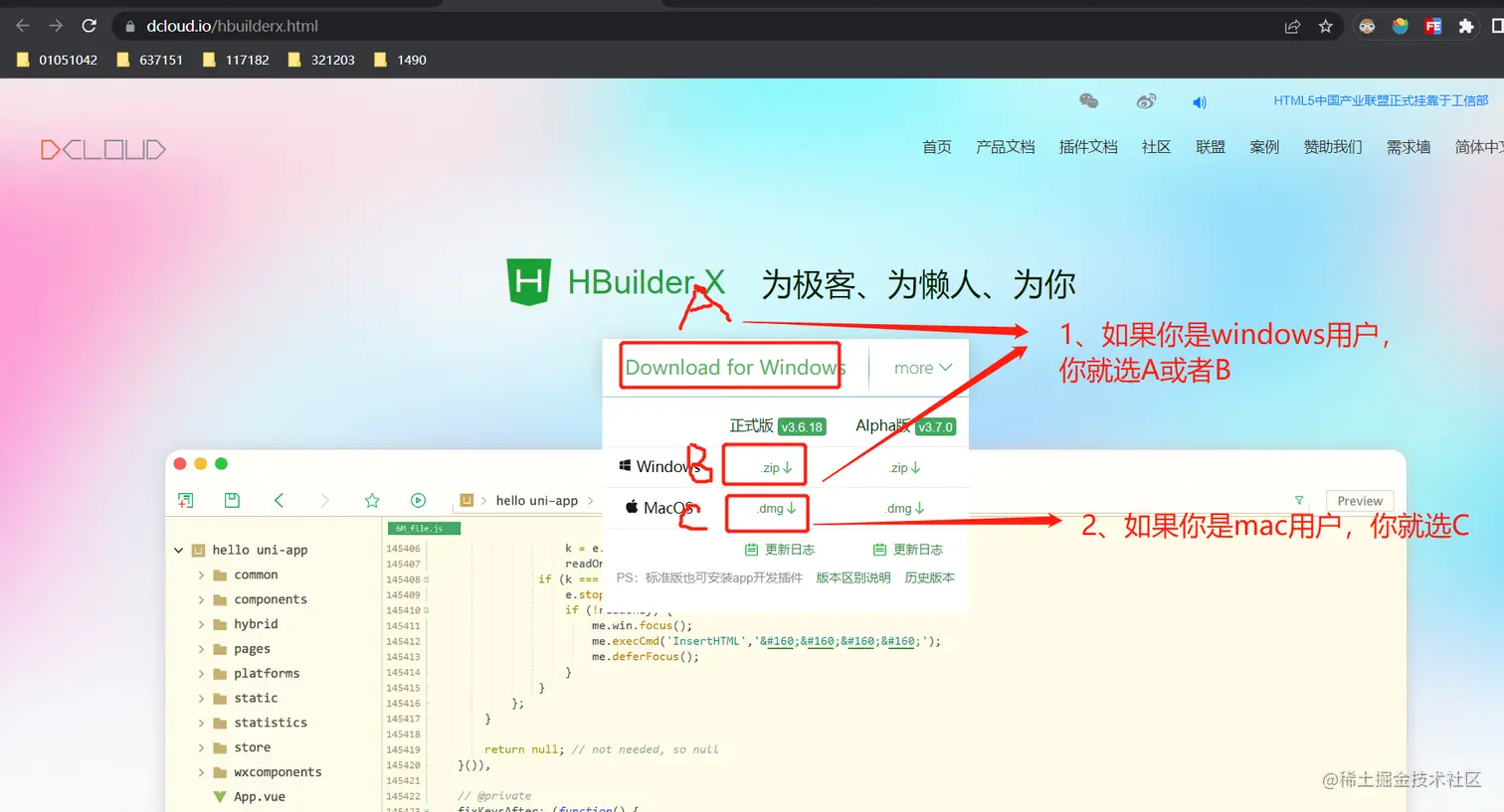 第一步,我们打开网址www.dcloud.io/hbuilderx.h… 开始做题,如果你是windows用户选图中A或者B,如果你是mac用户选C,如果你是unix或者Linux用户,没有这个选项,弃题吧!!!不弃题你就去跟DCloud公司提需求,快点开发Linux下的开发者工具。