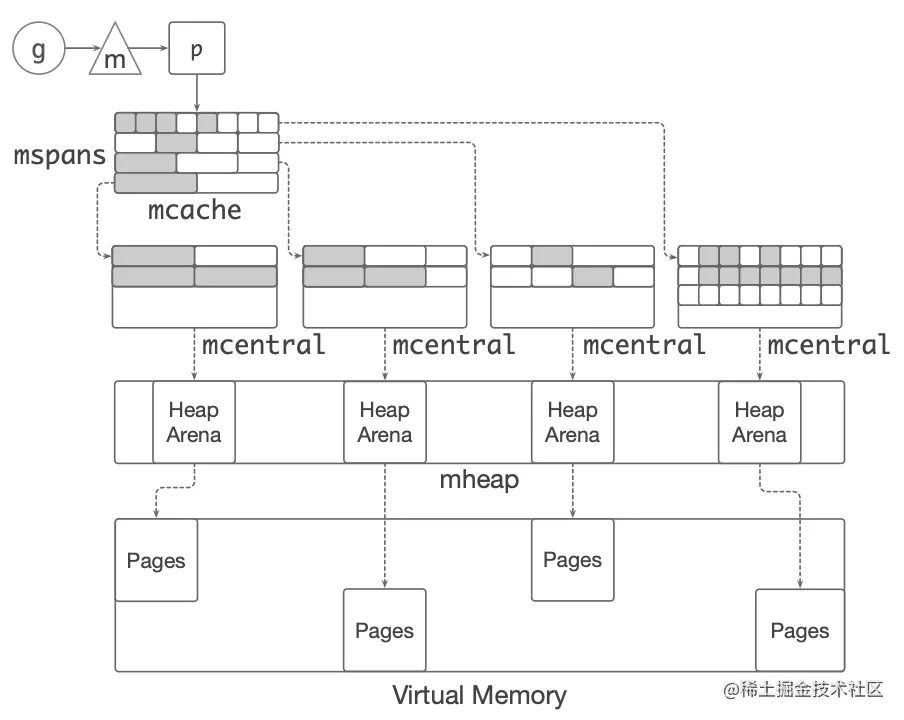 - Go 内存管理构成了多级缓存机制,从 OS 分配得的内存被内存管理回收后,也不会立刻归还给 OS,而是在 Go runtime 内部先缓存起来,从而避免频繁向 OS 申请内存。内存分配的路线图如下。