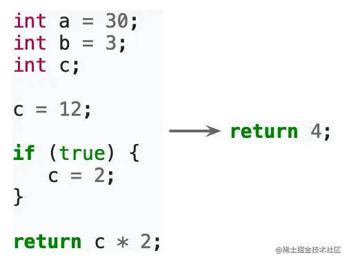 - 例如上面的程序。我们通过分析数据流和控制流,知道这个程序始终返回 4。编译器可以根据这个结果做出优化。