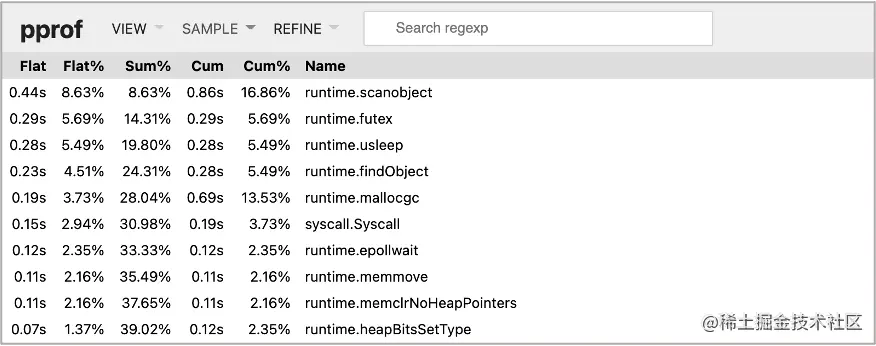 可以看到,用于分配对象的函数 mallocgc() 占用 CPU 较高