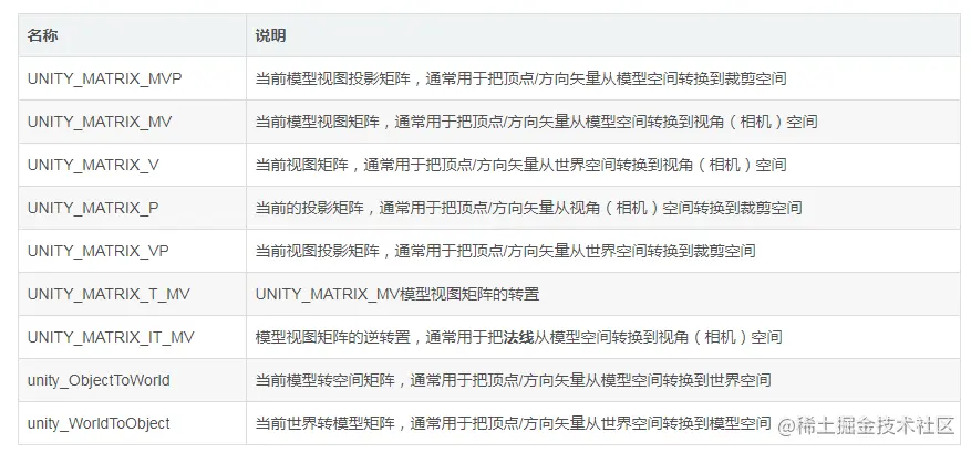 | _LightMatrix0(AutoLight.cginc 声明) | float4x4 | world-to-light 矩阵。用于样品 cookie 和衰减纹理 |