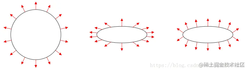 第一个原图,红色箭头表示法线。第二张图,表示 非等比 缩放,使用UnityObjectToWorldDir(),把法线从 模型空间 转换到 世界空间,法线也会被压扁并且不再垂直于曲面。第三张图,表示 非等比 缩放,使用UnityObjectToWorldNormal(),把法线从 模型空间 转换到 世界空间,法线是正确的垂直于曲面的。