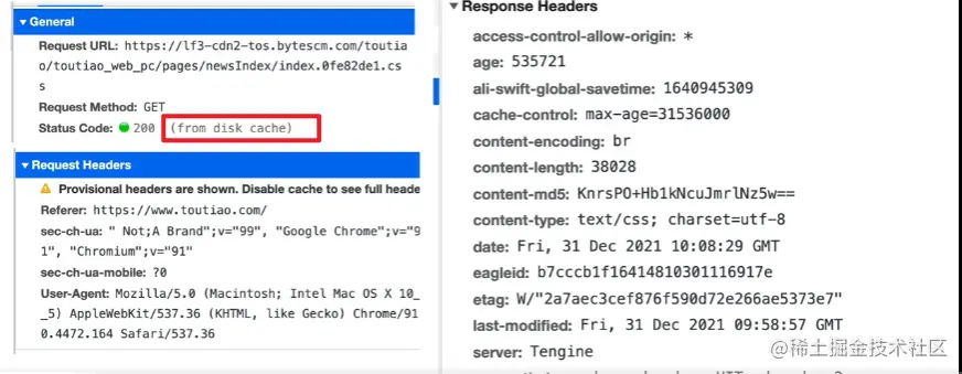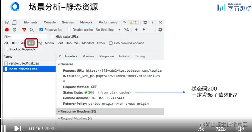 首先看静态资源场景,只要找到index开头,css结尾的文件就行。可以看到状态码是200,根据上一篇笔记的内容这个状态码代表客户端请求成功。但是浏览器真的向服务器发起了请求吗