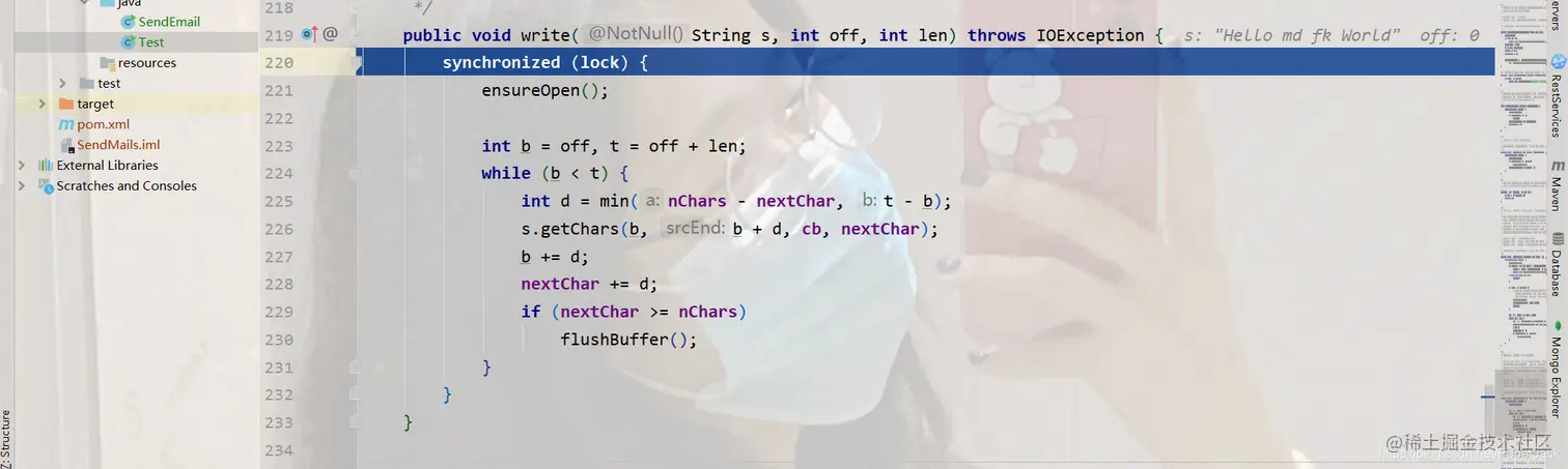 这个时候我们进入了print方法。这里也很好理解。你可以想想当我们的字符串为null的时候,你会发现输出的是一个字符串的null,而在源码里面正好就是这样的设计。紧接着,将会调用该类中的write方法。那行,我们继续进入write方法。
