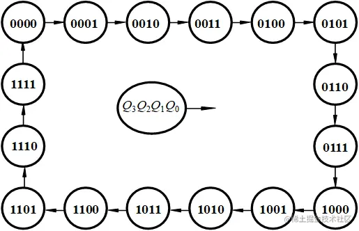 电路首先在CLR_的作用下,输出被清零。此后当CLR_=1时,每当CP上升沿到来时,电路状态Q就在原来二进制值的基础上增加1,即符合二进制递增计数的规律,直到计数值为1111时,再来一个CP上升沿,计数值回到0000,重新开始计数。故称该电路为4位二进制递增计数器(Ripplecounter:纹波计数器) 。