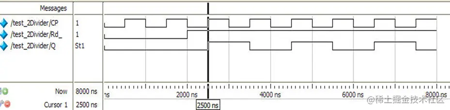 由图可知,时钟CP的周期为1000ns,在2000ns之前,清零信号Rd_有效,输出Q被清零。在此之后,Rd_=1,在2500ns时,CP上升沿到来,Q=1;到下一个CP上升沿(3500ns)时,Q=0,再到下一个CP上升沿(4500ns)时,Q=1,……,如此重复,直到8000ns时,系统任务$stop被执行,仿真停止。