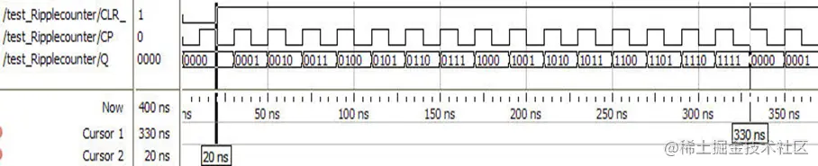 - 再到下一个CP上升沿(70ns)时,Q=0011,……,如此重复,到310ns时,Q=1111,