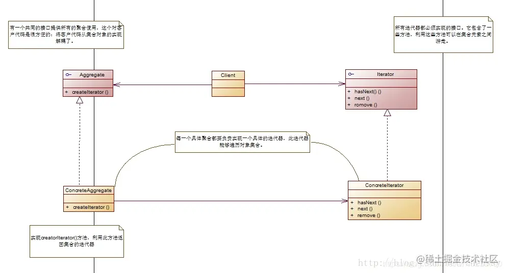 迭代器模式提供一种访问集合中的各个元素,而不暴露其内部表示的方法。将在元素之间游走的职责交给迭代器,而不是集合对象,从而简化集合容器的实现,让集合容器专注于在它所应该专注的事情上,更加符合单一职责原则,避免在集合容器的抽象接口层中充斥着各种不同的遍历操作。迭代器模式的UML结构图如下: