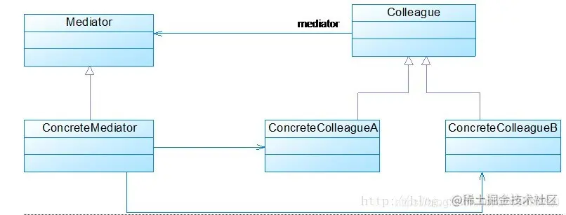在中介者模式中,中介者类处于核心地位,它封装了系统中所有对象类之间的关系,除了简化对象间的关系,还可以对对象间的交互进行进一步的控制。中介者模式的UML结构图如下: