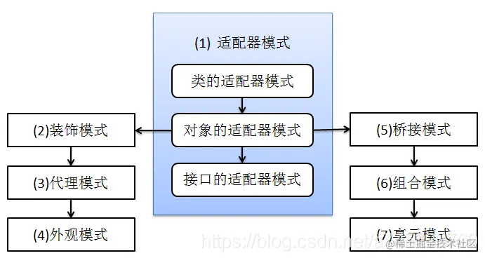 上面我们介绍了5种创建型模式,下面我们就开始介绍下7种结构型模式:适配器模式、装饰模式、代理模式、外观模式、桥接模式、组合模式、享元模式。其中对象的适配器模式是各种模式的起源,如下图: