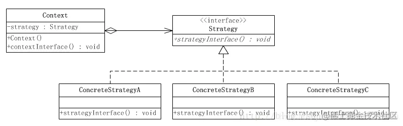 比如定义一系列的算法,把每一个算法封装起来,并且使它们可相互替换,使得算法可独立于使用它的客户而变化,这就是策略模式。UML结构图如下: