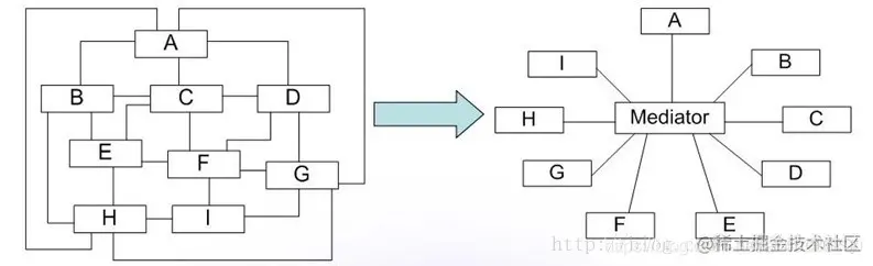 中介者模式通过中介者对象来封装一系列的对象交互,将对象间复杂的关系网状结构变成结构简单的以中介者为核心的星形结构,对象间一对多的关联转变为一对一的关联,简化对象间的关系,便于理解;各个对象之间的关系被解耦,每个对象不再和它关联的对象直接发生相互作用,而是通过中介者对象来与关联的对象进行通讯,使得对象可以相对独立地使用,提高了对象的可复用和系统的可扩展性。