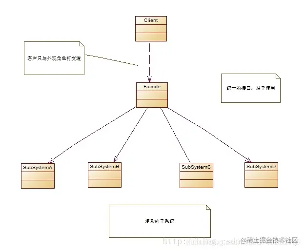 (3)更好的划分访问层次:通过合理使用 Facade,可以更好地划分访问的层次,有些方法是对系统外的,有些方法是系统内部使用的。把需要暴露给外部的功能集中到门面中,这样既方便客户端使用,也很好地隐藏了内部的细节。