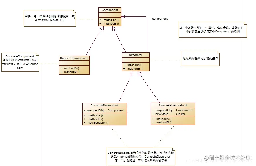 装饰器模式可以动态给对象添加一些额外的职责从而实现功能的拓展,在运行时选择不同的装饰器,从而实现不同的行为;比使用继承更加灵活,通过对不同的装饰类进行排列组合,创造出很多不同行为,得到功能更为强大的对象;符合“开闭原则”,被装饰类与装饰类独立变化,用户可以根据需要增加新的装饰类和被装饰类,在使用时再对其进行组合,原有代码无须改变。装饰器模式的UML结构图如下: