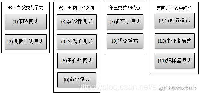- 行为型模式:共11种:策略模式、模板方法模式、观察者模式、责任链模式、访问者模式、中介者模式、迭代器模式、命令模式、状态模式、备忘录模式、解释器模式