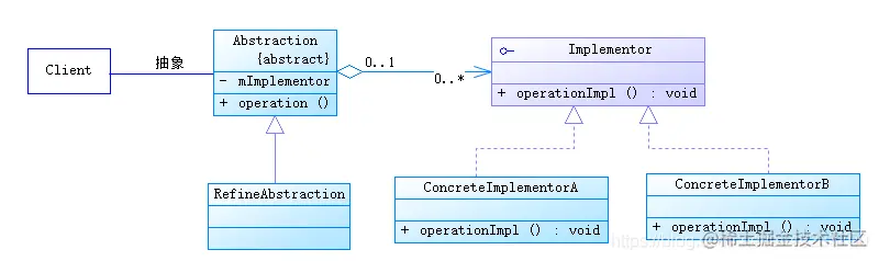 桥接模式符合“开闭原则”,提高了系统的可拓展性,在两个变化维度中任意扩展一个维度,都不需要修改原来的系统;并且实现细节对客户不透明,可以隐藏实现细节。但是由于聚合关系建立在抽象层,要求开发者针对抽象进行编程,这增加系统的理解和设计难度。桥接模式的UML结构图如下: