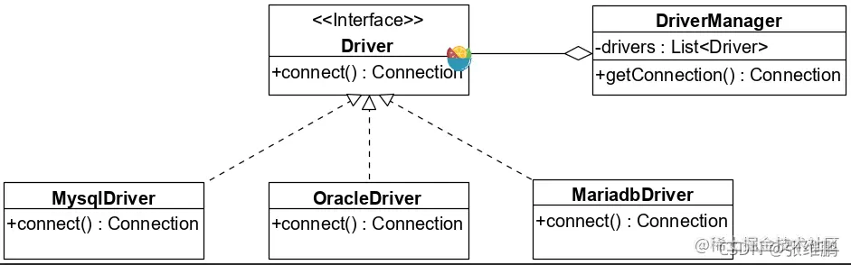 在 JDBC 中,桥接模式的实现化角色 (Implementor) 为的 Driver 接口,具体实现化 (Concrete Implementor) 角色对应 MysqlDriver、OracleDriver 和 MariadbDriver,扩展抽象化 (Refined Abstraction) 角色对应 DriverManager,不具有抽象化 (Abstraction) 角色作为扩展抽象化角色的父类。