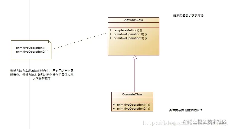 模板方法是基于继承实现的,在抽象父类中声明一个模板方法,并在模板方法中定义算法的执行步骤(即算法骨架)。在模板方法模式中,可以将子类共性的部分放在父类中实现,而特性的部分延迟到子类中实现,只需将特性部分在父类中声明成抽象方法即可,使得子类可以在不改变算法结构的情况下,重新定义算法中的某些步骤,不同的子类可以以不同的方式来实现这些逻辑。