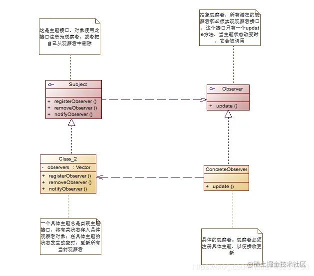但观察者模式的缺点在于如果存在很多个被观察者的话,那么将需要花费一定时间通知所有的观察者,如果观察者与被观察者之间存在循环依赖的话,那么可能导致系统崩溃,并且观察者模式没有相应的机制让观察者知道被观察对象是怎么发生变化的,而仅仅只是知道观察目标发生了变化。观察者模式的UML结构图如下: