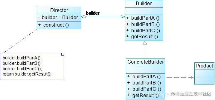 建造者模式将复杂产品的创建步骤分解在在不同的方法中,使得创建过程更加清晰,从而更精确控制复杂对象的产生过程;通过隔离复杂对象的构建与使用,也就是将产品的创建与产品本身分离开来,使得同样的构建过程可以创建不同的对象;并且每个具体建造者都相互独立,因此可以很方便地替换具体建造者或增加新的具体建造者,用户使用不同的具体建造者即可得到不同的产品对象。UML结构图如下: