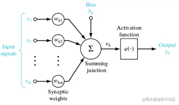 图解:为输入信号,为对应的权重,输入信号与对应的权重相乘后经过对应的累加函数(累加函数中有一个对应的偏差与结果相加),累加的结果作为一个输出部分,该输出部分经过激活函数得到最终输出结果(正是由于激活函数的存在,神经网络拥有了非线性的能力)