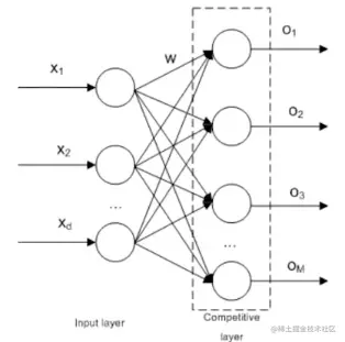 - 自组织学习:使网络具有某种“记忆”能力,以至形成“条件反射”。当曾经学习过的或相似的刺激加入后,输出端便按权矩阵产生相应的输出。如自组织映射(Self Organization Mapping,简写为SOM)算法。
