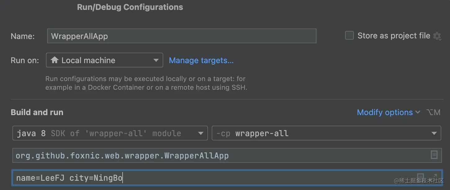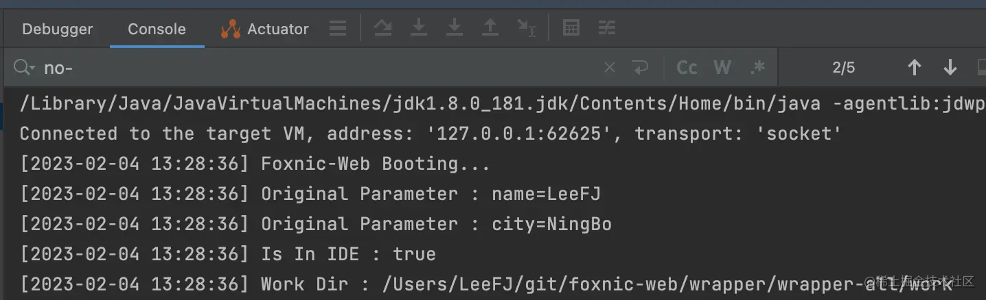 启动参数是指通过启动命令向 SpringBoot 应用传入的参数,他们被 main 函数的参数接收并处理。如图,设置两个参数 name=LeeFJ city=NingBo :