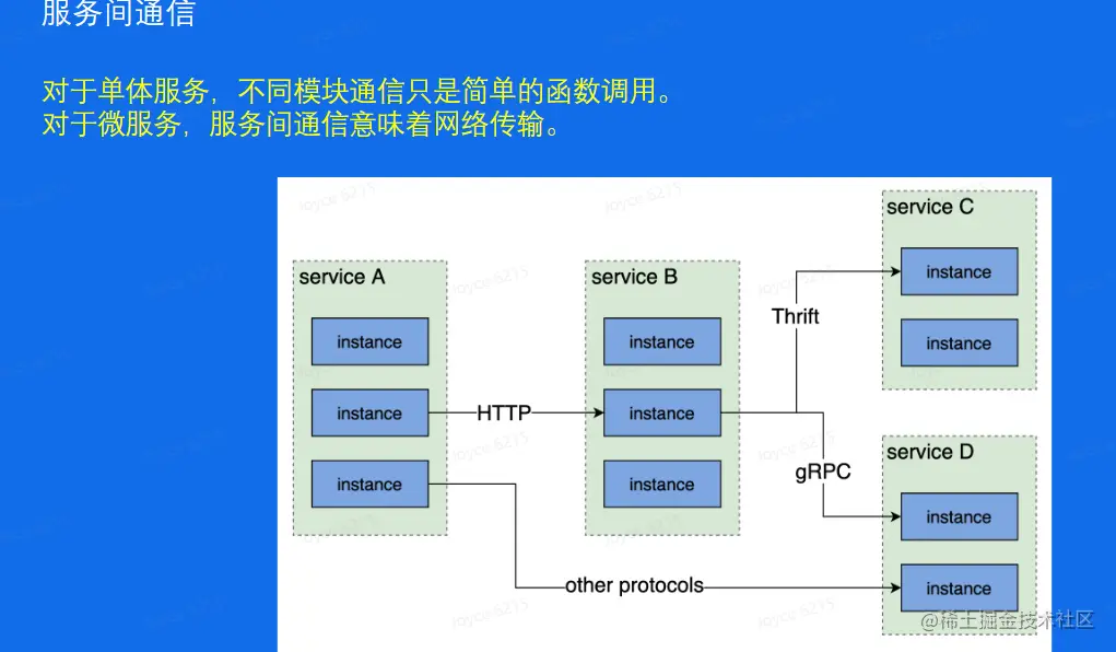 对于单体服务,不同模块通信只是简单的函数调用。对于微服务,服务间通信意味着网络传输。