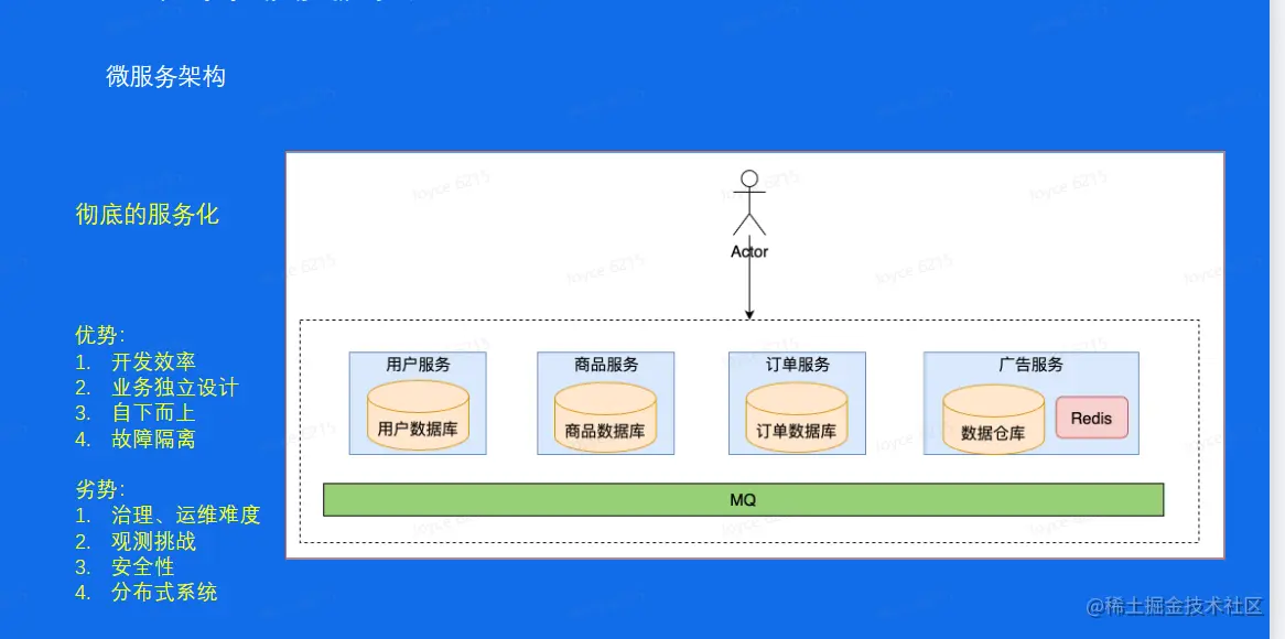缺点:治理、运维难度急剧增加;观测挑战;安全等问题;分布式系统本身的复杂性