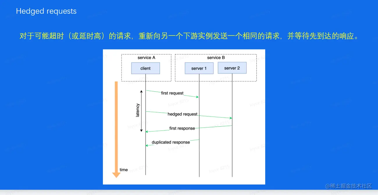 - 对于可能超时(或延时高)的请求,重新向另一个下游实例发送一个相同的请求,并等待先到达的响应
