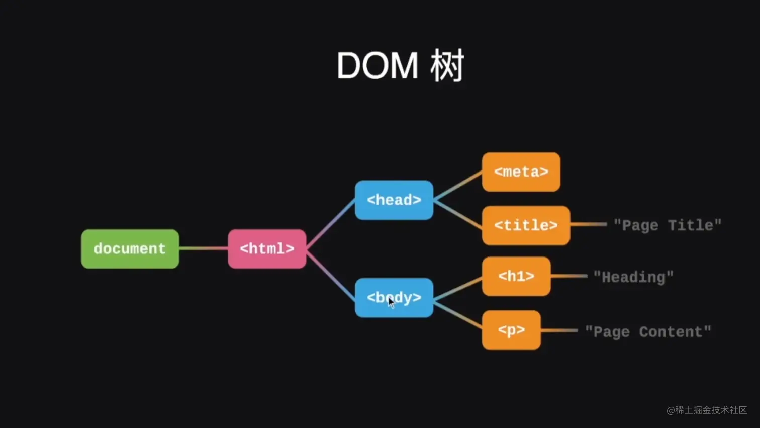 下面是DOM树的结构,里面的每一个节点是DOM节点