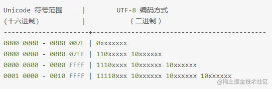 以 「严」为例,「严」的 Unicode 是 4E25 (100111000100101),根据上表,可以发现 4E25 处在第三行范围内(0000 0800 - 0000 FFFF),因此 「严」的 UTF-8 编码需要 3 个字节,即格式为 1110xxxx 10xxxxxx 10xxxxxx。然后,从「严」的最后一个二进制位开始,依次从后向前填入格式中的 x,多出的位补 0。这样就得到来「严」的 UTF-8 编码是 11100100 10111000 10100101,转换成十六进制就是 E4B8A5。