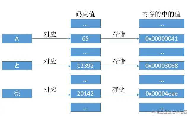 是不是简单明了,码点值多少,内存就存多少。不过,这样的存储虽然简单,但缺点也很明显:字母 A 原本只需要 1 个字节存储,但现在却用去了 4 个字节,而且大部分位置都是 0,造成了很大的浪费。