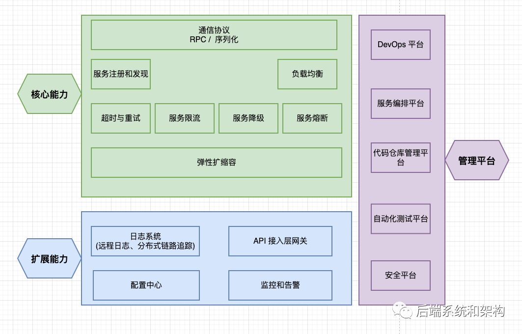 微服务需要提供的核心能力包括:微服务架构模型中通讯的基础协议RPC、服务发现与注册、负载均衡、容错、熔断、限流、降级、弹性扩缩容等
