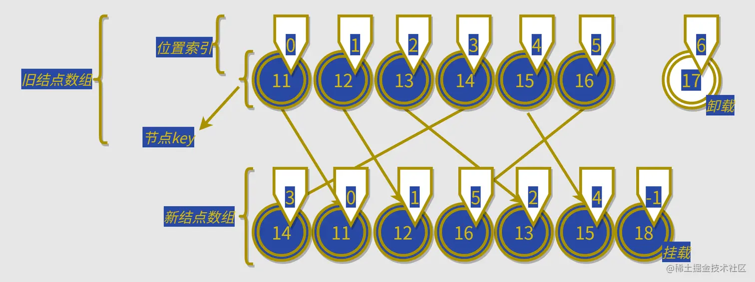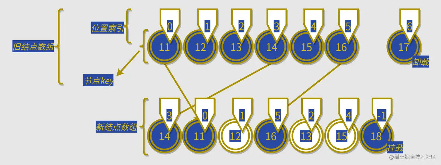 而我们的总目标就是要找到最少的移动次数,而旧数组的位置索引在newIndexToOldIndexMap是递增的顺序,所以我们只需要找到新结点数组的最长的递增的结点们,就能找到最优的移动策略,然后进行移动就可以了,如图: